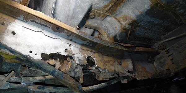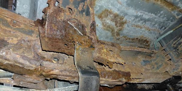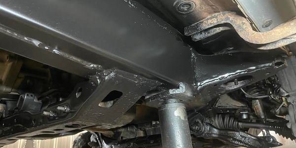 The newly fabricated steel is coated with an underbody epoxy, similar to that used on heavy-duty industrial equipment such as semi-trucks, garbage trucks, and dump trucks. This protective coating safeguards the new steel from road hazards, including salt, stones, and other debris. The frame's interior is coated with Fluid Film, which penetrates existing rust and prevents further corrosion through hydrophobic capillary action.